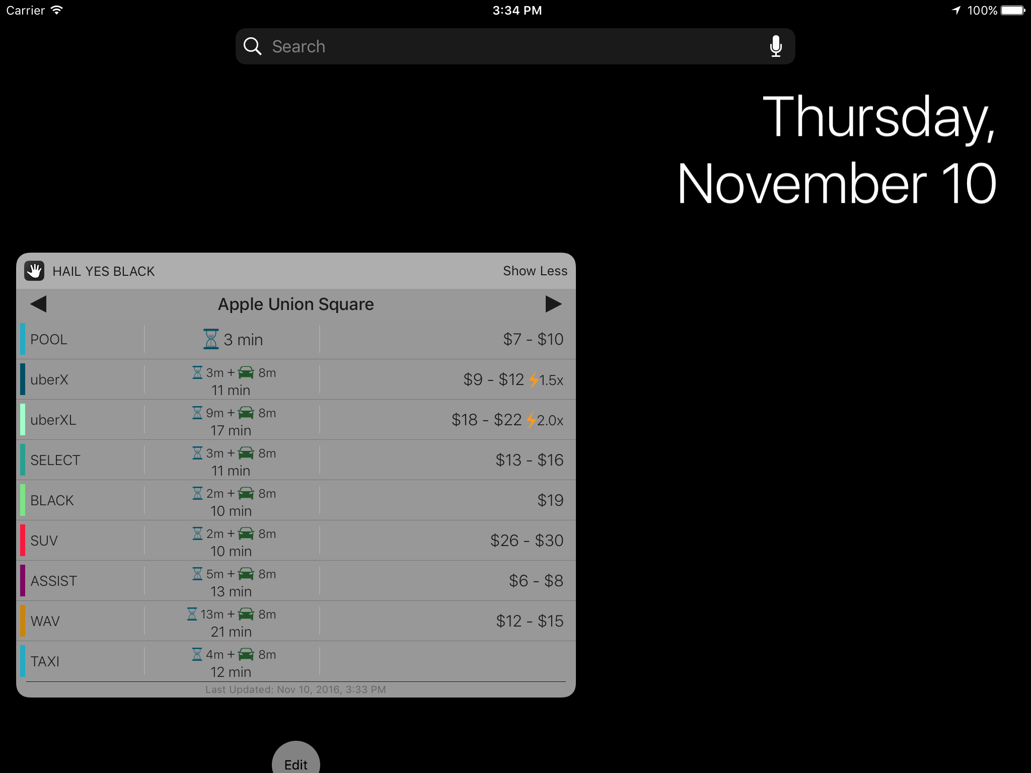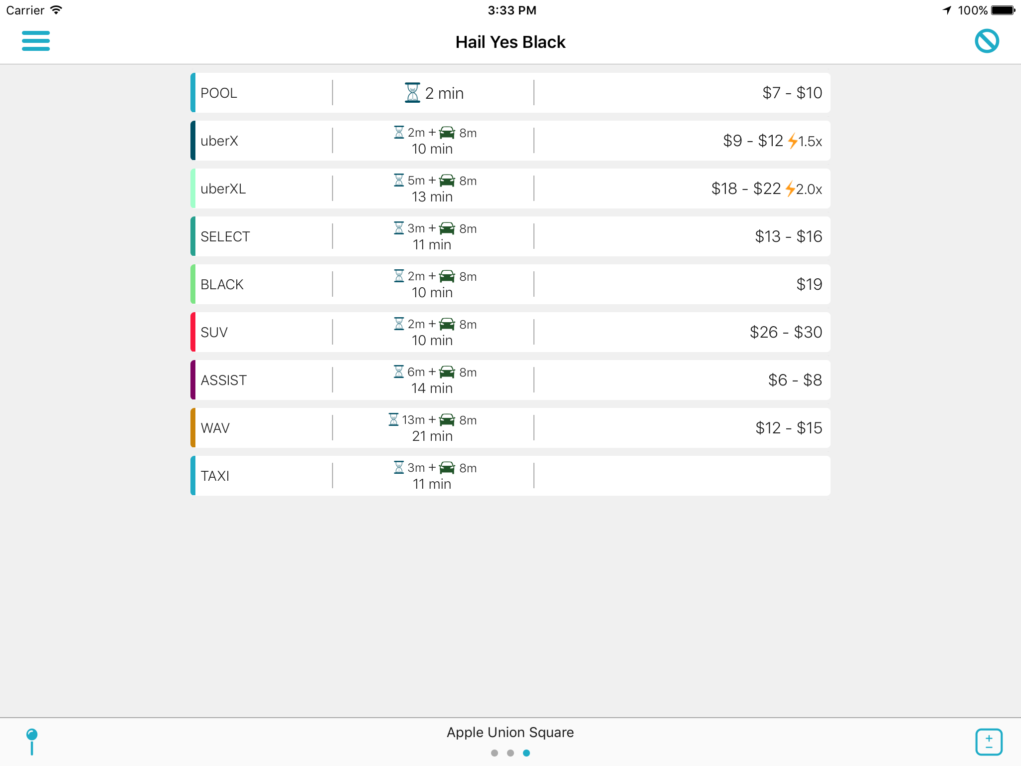 Hail Yes is a suite of apps which can be used to get a quick snapshot of time and price estimates for all of the different car types on the car hailing services Uber and Lyft (with more to come soon).